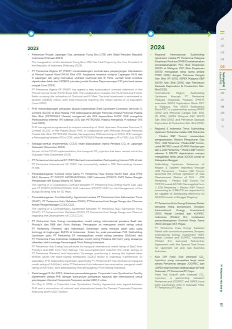%u2022 Regional Internasional Subholding Upstream melalui PT Pertamina Malaysia Eksplorasi Produksi (PMEP) melaksanakan penandatanganan PSC Blok Eksplorasi SK510 di Malaysia. PSC Blok Eksplorasi SK510 merupakan kerja sama antara PMEP (25%) dengan Petronas Carigali Sdn. Bhd. (PI 40%), INPEX Malaysia E&P SK510 Sdn. Bhd (25%), dan Petroleum Sarawak Exploration & Production Sdn. Bhd (10%).International Region Subholding Upstream through PT Pertamina Malaysia Eksplorasi Produksi (PMEP) executed SK510 Exploration Block PSC in Malaysia. The SK510 Exploration Block PSC is a partnership among PMEP (25%) and Petronas Carigali Sdn. Bhd. (PI 40%), INPEX Malaysia E&P SK510 Sdn. Bhd (25%), and Petroleum Sarawak Exploration & Production Sdn. Bhd (10%).%u2022 Regional 4 Indonesia Timur Subholding Upstream Pertamina melalui JOB Pertamina %u2013 Medco E&P Tomori, meresmikan pengoperasian Stasiun Pengukuran Gas PLN - JOB Pertamina - Medco E&P Tomori, untuk PKTMG Luwuk 40 MW. Pasokan gas dari J JOB Pertamina %u2013 Medco E&P Tomori sebesar 5 BBUTD diperkirakan mampu mengalirkan listrik untuk 30.000 rumah di Kabupaten Banggai.Subholding Upstream Pertamina of Region 4 Eastern Indonesia through JOB Pertamina %u2013 Medco E&P Tomori launched the official operation of Gas Measurement Station of PLN - JOB Pertamina - Medco E&P Tomori, for PKTMG Luwuk 40 MW. Gas supplies from J JOB Pertamina %u2013 Medco E&P Tomori amounting to 5 BBUTD are expected to be capable of distributing electricity to 30,000 houses in Banggai Regency.%u2022 PT Pertamina Hulu Energi Sulawesi Melati bersama mitra konsorsium, Sinopec International Energy Investment(SIEI) Melati Limited dan KUFPEC Indonesia (Melati) B.V, melakukan penandatanganan Kontrak Kerja Sama (KKS) dengan SKK Migas.PT Pertamina Hulu Energi Sulawesi Melati with consortium partners, Sinopec International Energy Investment (SIEI) Melati Limited and KUFPEC Indonesia (Melati) B.V executed Partnership Agreement with the Special Task Force for Upstream Oil and Gas Business Activities.%u2022 Kick Off Field Trial Interwell CO2Injection, yang merupakan kerja sama antara Pertamina dengan JOGMEC dan JAPEX telah berhasil dilaksanakan di Field Sukowati, PT Pertamina EP Cepu. Field Trial Kickoff with Interwell CO2Injection, a partnership between Pertamina and JOGMEC and JAPEX, have been sucessfully held in Sukowati Field, PT Pertamina EP Cepu. 2023 2024 %u2022 Peresmian Proyek Lapangan Gas Jambaran Tiung Biru (JTB) oleh Wakil Presiden Republik Indonesia (Februari 2023). The inauguration of the Jambaran Tiung Biru (JTB) Gas Field Project by the Vice President of the Republic of Indonesia (February 2023).%u2022 PT Pertamina Algeria EP (PAEP) menandatangani kontrak baru perpanjangan hidrokarbon di Menzel Lejmat Nord (MLN) Blok 405. Kerjasama tersebut meliputi Lapangan MLN dan 9 Lapangan lain yang mencakup unitisasi Ourhoud dan El Merk. Jumlah total investasi diperkirakan lebih dari USD800 juta dan jumlah Sumber Daya mencapai 150 juta barel setara minyak (Juni 2023). PT Pertamina Algeria EP (PAEP) has signed a new hydrocarbon contract extension in the Menzel Lejmat Nord (MLN) Block 405. The collaboration includes the MLN field and 9 other fields covering the unitization of Ourhoud and El Merk. The total investment is estimated to exceed USD800 million, with total resources reaching 150 million barrels of oil equivalent (June 2023).%u2022 PHE menandatangani perjanjian akuisisi kepemilikan Shell Upstream Overseas Services (I) Limited (SUOS) di Blok Masela. PHE bekerjasama dengan Petronas melalui Petronas Masela Sdn. Bhd. (PETRONAS Masela) mengambil alih 35% kepemilikan SUOS. PHE mengelola Participating Interest (PI) sebesar 20% dan PETRONAS Masela mengelola PI sebesar 15% (Juli 2023). PHE has signed an agreement to acquire ownership of Shell Upstream Overseas Services (I) Limited (SUOS) in the Masela Block. PHE, in collaboration with Petronas through Petronas Masela Sdn. Bhd. (PETRONAS Masela), has acquired a 35% ownership of SUOS. PHE manages a Participating Interest (PI) of 20%, while PETRONAS Masela manages a PI of 15% (July 2023). %u2022 Sebagai bentuk implementasi CCUS, telah dilaksanakan Injeksi Perdana CO2 di Lapangan Sukowati (Desember 2023).As part of the CCUS implementation, the inaugural CO2 injection has been carried out at the Sukowati Field (December 2023).%u2022 PT Pertamina International EP (PIEP) Berhasil menambahkan Participating Interest 10% di Irak.PT Pertamina International EP (PIEP) has successfully added a 10% Participating Interest in Iraq.%u2022 Penandatanganan Kontrak Kerja Sama PT Pertamina Hulu Energi North East Java (PHE NEJ) Bersama PT POSCO INTERNATIONAL ENP Indonesia (POSCO ENP) Dalam Rangka Pengelolaan WK Bunga Selama 30 Tahun.The signing of a Cooperation Contract between PT Pertamina Hulu Energi North East Java and PT POSCO INTERNATIONAL ENP Indonesia (POSCO ENP) for the Management of the Bunga Working Area for 30 Years.%u2022 Penandatanganan Confidentiality Agreement antara PT Pertamina Hulu Kalimantan Timur (PHKT), PT Pertamina Hulu Mahakam (PHM), PT Pertamina Hulu Sanga-Sanga, dan Chevron terkait Pengembangan CCS/CCUS. The signing of a Confidentiality Agreement between PT Pertamina Hulu Kalimantan Timur (PHKT), PT Pertamina Hulu Mahakam (PHM), PT Pertamina Hulu Sanga-Sanga, and Chevron regarding the Development of CCS/CCUS.%u2022 PT Pertamina Hulu Energi mendapatkan credit rating internasional perdana Baa2 dari Moody's dan BBB dari Fitch Ratings. Pencapaian ini menyamai credit rating untuk PT Pertamina (Persero) dan Indonesia%u2019s Sovereign, serta menjadi salah satu yang tertinggi di lingkungan BUMN di Indonesia. Selain itu, anak perusahaan PHE Subholding Upstream yaitu PT Pertamina EP mendapatkan credit rating perdana AAA(idn) dan PT Pertamina Hulu Indonesia medapatkan credit rating Perdana AA+(idn) yang keduanya diberikan oleh Lembaga Pemeringkat Fitch Rating Indonesia.PT Pertamina Hulu Energi has achieved its inaugural international credit rating of 
