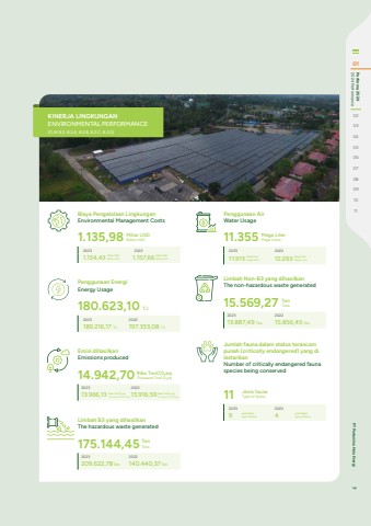Penggunaan AirWater Usage11.3552023 202211.913 12.293Mega LiterMega LitersMega LiterMega LitersMega LiterMega LitersPenggunaan EnergiEnergy Usage180.623,10 TJ2023 2022189.216,17 TJ 197.333,08 TJEmisi dihasilkanEmissions produced14.942,702023 202213.966,13 13.916,59Ribu TonCO2eqThousand TonCO2eqRibu TonCO2eqThousand TonCO2eqRibu TonCO2eqThousand TonCO2eqLimbah Non-B3 yang dihasilkanThe non-hazardous waste generated15.569,272023 202213.887,49 Ton 15.856,45 TonTonTonsLimbah B3 yang dihasilkanThe hazardous waste generated175.144,452023 2022209.622,78Ton 140.440,37 TonTonTonsJumlah fauna dalam status terancampunah (critically endangered) yang di lestarikanNumber of critically endangered fauna species being conserved112023 20229 4Jenis faunaType of faunajenis faunatype of faunajenis faunatype of faunaKINERJA LINGKUNGANENVIRONMENTAL PERFORMANCE [OJK B.2, B.2.A, B.2.B, B.2.C, B.2.D]Biaya Pengelolaan LingkunganEnvironmental Management Costs1.135,982023 20221.134,43 1.157,66Miliar USDBillion USDMiliar USDBillion USDMiliar USDBillion USD01 2024 Performance Performa 202402030405060708091011 PT Pertamina Hulu Energi 7