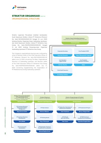Struktur organisasi Perusahaan disahkan berdasarkan Surat Keputusan Direktur Utama PT Pertamina (Persero) No. Kpts-19/C00000/2020-S0 tanggal 16 Juni 2020 tentang Struktur Organisasi Dasar Subholding Upstream, dan Surat Keputusan Direktur Utama PT Pertamina Hulu Energi No. Kpts-052/PHE00000/2022/S0 tanggal 15 Juli 2022 tentang Penyempurnaan Organisasi Subholding Upstream PT Pertamina Hulu Energi. The Company%u2019s organizational structure was confirmed by virtue of Decision Letter of the Chief Executive Officer of PT Pertamina (Persero) No. Kpts-19/C00000/2020-S0 dated June 16, 2020 concerning The Basic Organizational Structure of Subholding Upstream, and Decision Letter of the Chief Executive Officer PT Pertamina Hulu Energi No. Kpts-052/PHE00000/2022/S0 dated July 15, 2024 concerning Supplementing the Organization of PT Pertamina Hulu Energi Subholding Upstream.STRUKTUR ORGANISASI [GRI 2-6]ORGANIZATIONAL STRUCTUREVice President HSSEGelar Winayawidhi SugandaVice PresidentUpstream InnovationAkbarVice PresidentLegal CounselSiti Nur MaulinaCorporate SecretaryArya Dwi ParamitaChief Audit ExecutiveEri Sulistyo SutiknoVP Upstream Business Planning & Portfolio ManagementAsep Samsul ArifinVP Upstream Business DevelopmentToriq AbdatVP Commercial & MonetizationDwi Darmawanta HartadjajaRachmat HidajatDirektur Perencanaan Strategis & Pengembangan Bisnis Director of Strategic Planning & Business DevelopmentVP New VentureBintoro WibowoVP Existing AssetsBayu GiriansyahVP Exploration Technical Excellence & CoordinationAhmad Najihal AmalMuharram Jaya PangurisengDirektur Eksplorasi Director of ExplorationVP Subsurface Development & Resources EvaluationAndri HaribowoVP Drilling & Well InterventionFata YunusVP Production & ProjectBenny Hidajat SidikVP D&P Technical Excellence & CoordinationDevialina Puspita DewiAwang LazuardiDirektur Pengembangan & Produksi Director of Development & ProductionChalid Said SalimDirektur Utama Subholding Upstream Chief Executive Officer of Subholding UpstreamHULU ENERGILaporan Keberlanjutan %u2022 Sustainability Report 94