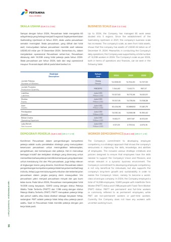 SKALA USAHA [OJK C.3, C.3.A]Sampai dengan tahun 2024, Perusahaan telah mengelola 65 wilayah kerja yang terbagi menjadi 5 regional. Sejak pembentukan Subholding Upstream di tahun 2021, skala usaha perusahaan semakin meningkat. Skala perusahaan, yang dilihat dari total aset, menunjukkan bahwa perusahaan memiliki aset sebesar USD30,43 miliar per 31 Desember 2024. Sementara itu, dalam menjalankan operasional Perusahaan sehari-hari, Perusahaan didukung oleh 14.008 orang total pekerja pada tahun 2024. Skala perusahaan per tahun 2024, baik dari segi operasional maupun finansial dapat dilihat pada tabel berikut ini:DeskripsiDescriptionSatuanUnit 2024 2023 2022Jumlah Pekerja Number of Workers OrangPerson 14.008,00 14.154,00 14.137,00Jumlah Produksi Production Quantity MBOEPD 1.044,60 1.043,73 967,37LiabilitasLiabilitiesJuta USDMillion USD 15.327,60 16.710,36 16.323,51Ekuitas EquityJuta USDMillion USD 15.107,35 14.178,56 15.158,28Aset AssetsJuta USDMillion USD 30.434,96 30.888,92 31.481,79Pendapatan IncomeJuta USDMillion USD 14.330,34 14.568,38 16.183,40Beban Usaha Operating ExpensesJuta USDMillion USD 9.330,71 8.917,87 8.510,59Laba BersihNet IncomeJuta USDMillion USD 3.121,03 2.725,54 4.674,16DEMOGRAFI PEKERJA [OJK C.3.B] [GRI 2-7, 2-8]Komitmen Perusahaan dalam pengembangan kompetensi pekerja adalah suatu pendekatan strategis yang menunjukkan keseriusan perusahaan untuk meningkatkan keterampilan, pengetahuan, dan kemampuan dari pekerja. Hal ini mencakup berbagai inisiatif dan kebijakan strategis yang dirancang untuk memastikan bahwa pekerja memiliki kemampuan yang diperlukan untuk mendukung Visi dan Misi perusahaan, juga tetap relevan di lingkungan bisnis yang dinamis. Komitmen Perusahaan dalam pengembangan kompetensi pekerja tidak hanya bermanfaat bagi individu, tetapi juga mendukung pertumbuhan dan keberlanjutan perusahaan dalam jangka panjang demi mewujudkan Visi perusahaan yakni menjadi perusahaan minyak dan gas bumi kelas dunia. Pada tahun 2024, Perusahaan mempekerjakan total 14.008 orang karyawan, 12.810 orang dengan status Pekerja Waktu Tidak Tertentu (PWTT) dan 1.198 orang dengan status Pekerja Waktu Tertentu (PWT). PWTT merupakan pekerja tetap dan penuh waktu atau biasa disebut sebagai karyawan tetap, sedangkan PWT adalah pekerja tidak tetap atau pekerja paruh waktu. Saat ini Perusahaan tidak memiliki pekerja dengan jam kerja tidak pasti.BUSINESS SCALE [OJK C.3, C.3.A]Up to 2024, the Company has managed 65 work areas divided into 5 regions. Since the establishment of the Subholding Upstream in 2021, the company%u2019s business scale has increased. The company%u2019s scale, as seen from total assets, shows that the company has assets of USD30.43 billion as of December 31, 2024. Meanwhile, in conducting the Company%u2019s daily operations, the Company was supported by a total number of 14,008 workers in 2024. The Company%u2019s scale as per 2024, both in terms of operations and finances, can be seen in the following table:WORKER DEMOGRAPHICS [OJK C.3.B] [GRI 2-7, 2-8]The Company%u2019s commitment to developing employee competency is a strategic approach that shows the company%u2019s seriousness in improving the skills, knowledge, and abilities of employees. This includes various strategic initiatives and policies designed to ensure that employees have the skills needed to support the Company%u2019s Vision and Missions, and remain relevant in a dynamic business environment. The Company%u2019s commitment to developing employee competency is not only beneficial for individuals, but also supports the company%u2019s long-term growth and sustainability in order to realize the Company%u2019s Vision, namely to become a worldclass oil and gas company. In 2024, the Company employed a total of 14,008 employees, 12,810 people with Indefinite-Term Worker (PWTT) status and 1,198 people with Fixed-Term Worker (PWT) status. PWTT are permanent and full-time workers or commonly referred to as permanent employees, while PWT are non-permanent workers or part-time workers. Currently the Company does not have any workers with uncertain working hours.HULU ENERGILaporan Keberlanjutan %u2022 Sustainability Report 96
